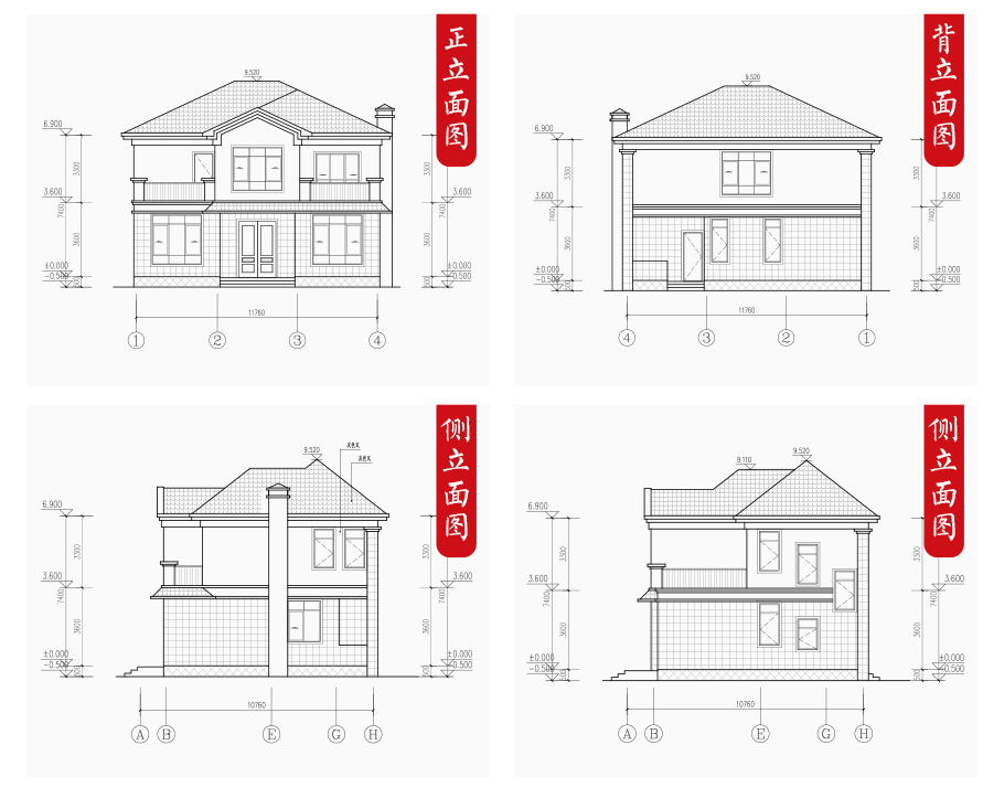 建筑立面圖:東立面圖,西立面圖,南立面圖,北立面圖,剖面圖;