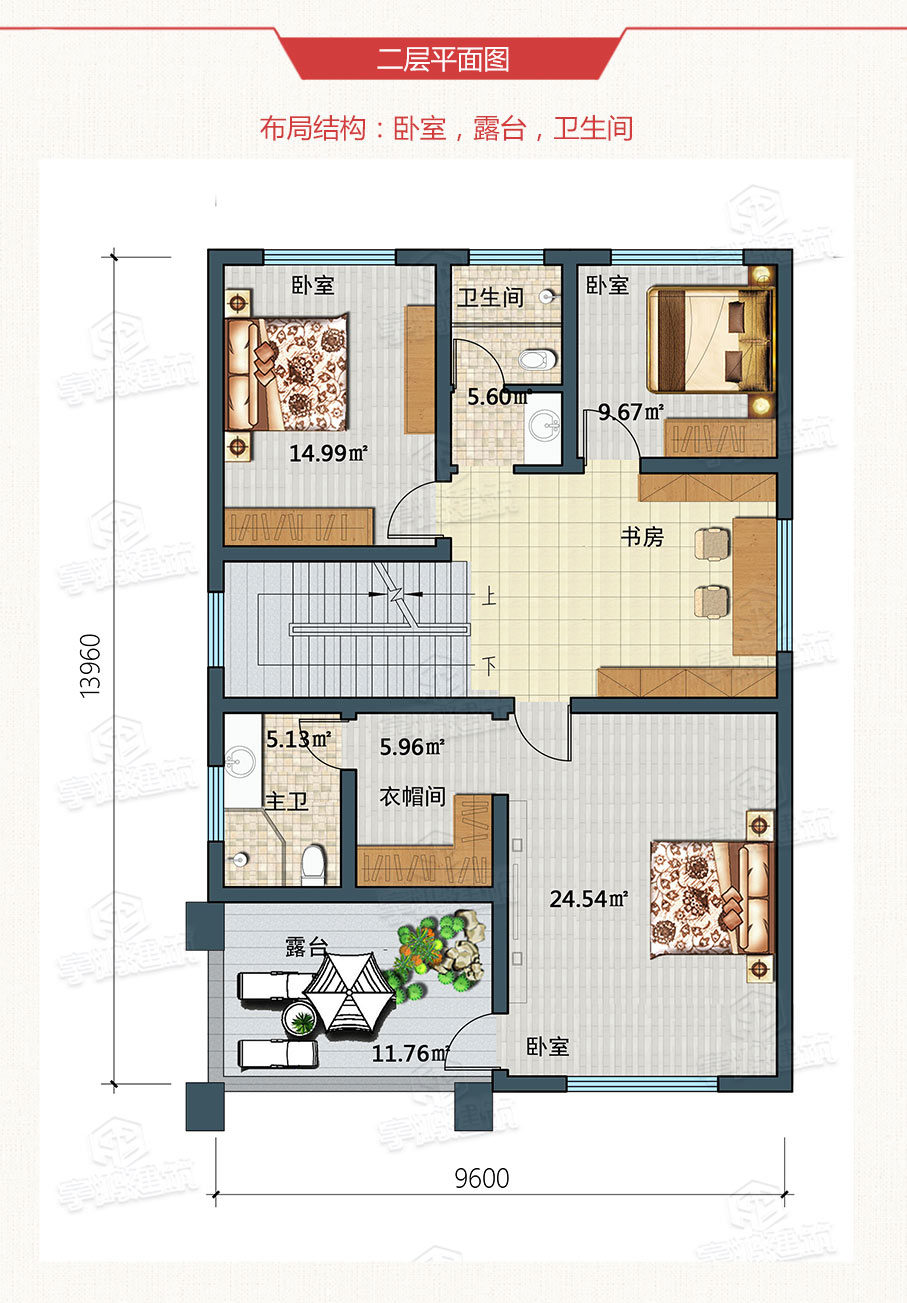 成品圖紙>帶露臺的西班牙風(fēng)格二層小農(nóng)村別墅戶型及效果圖