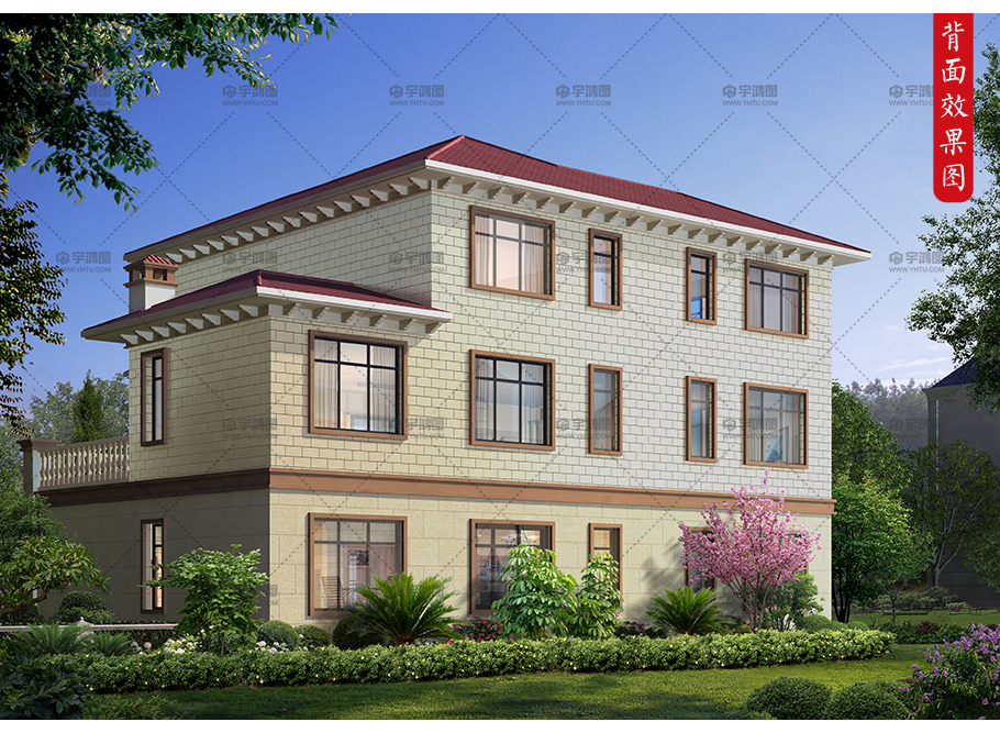 2019年鄉(xiāng)村新款帶灶房三層歐式別墅設(shè)計圖,框架結(jié)構(gòu)。一層門廳進入33平方米大堂屋,堂屋東側(cè)有餐客廳大通間,餐廳東側(cè)雜物間,清洗池,灶房,廚房一體化。樓梯間有儲藏空間,堂屋西側(cè)有2個臥室。二層有4個臥室,一個起居室,一個儲藏間,洗衣房,露臺,陽臺。三層有3個臥室,其中兩個帶衣帽間,南側(cè)和西側(cè)各有一個露臺。