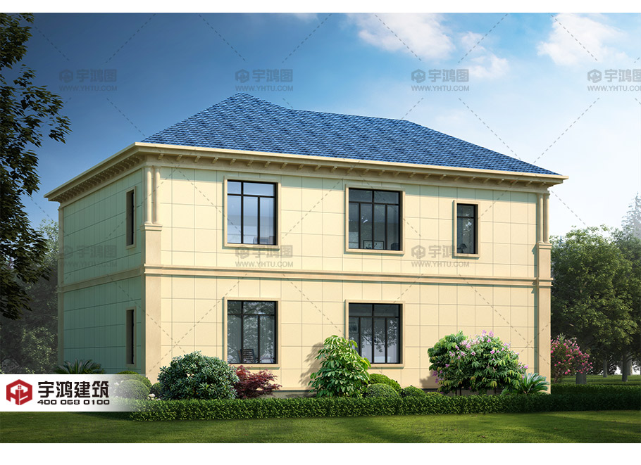 180平新農村復式小別墅設計圖紙,清新淡雅外觀效果圖。一層25平方米大門廳連接入戶玄關,客廳在玄關右側,客廳中空帶旋轉樓梯設計,30平方米大餐廳與12平方米廚房相連,與衛生間隔離。22平方米大主臥帶套衛。二層戶型為3個臥室一個起居室,每個臥室均有套衛,生活便利。主臥帶衣帽間,起居室外側有一個22平方米的露臺和一個12平方米的陽臺。