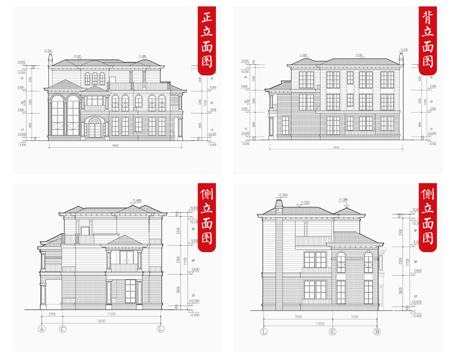 | 建筑圖: | 建筑平面圖:一層平面圖,二層平面圖,三層平面圖; 建筑立面圖:東立面圖,西立面圖,南立面圖,北立面圖,剖面圖; 大樣圖:樓梯詳圖,細部大樣,門窗大樣 |