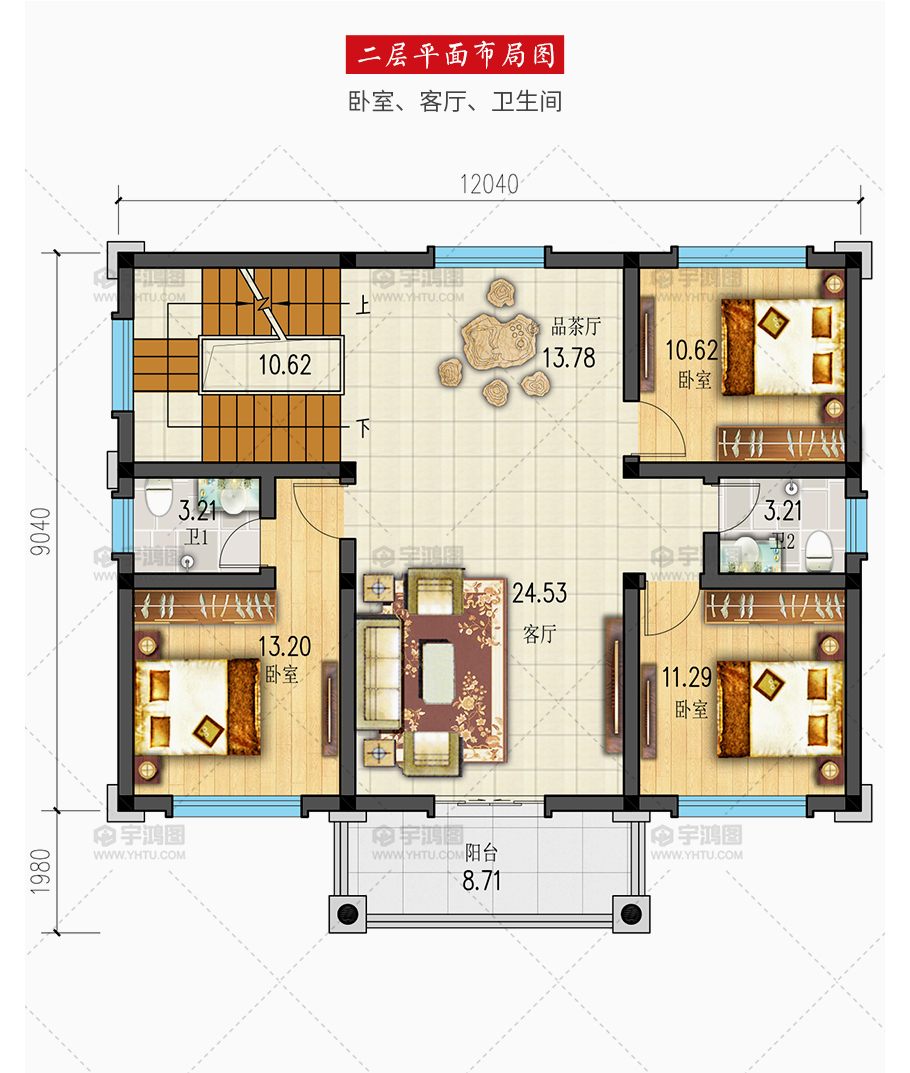 | 開間:12.04米 | 進深:11.02米 | 占地面積:108.8平方米 | 建筑面積:300.18平方米 |