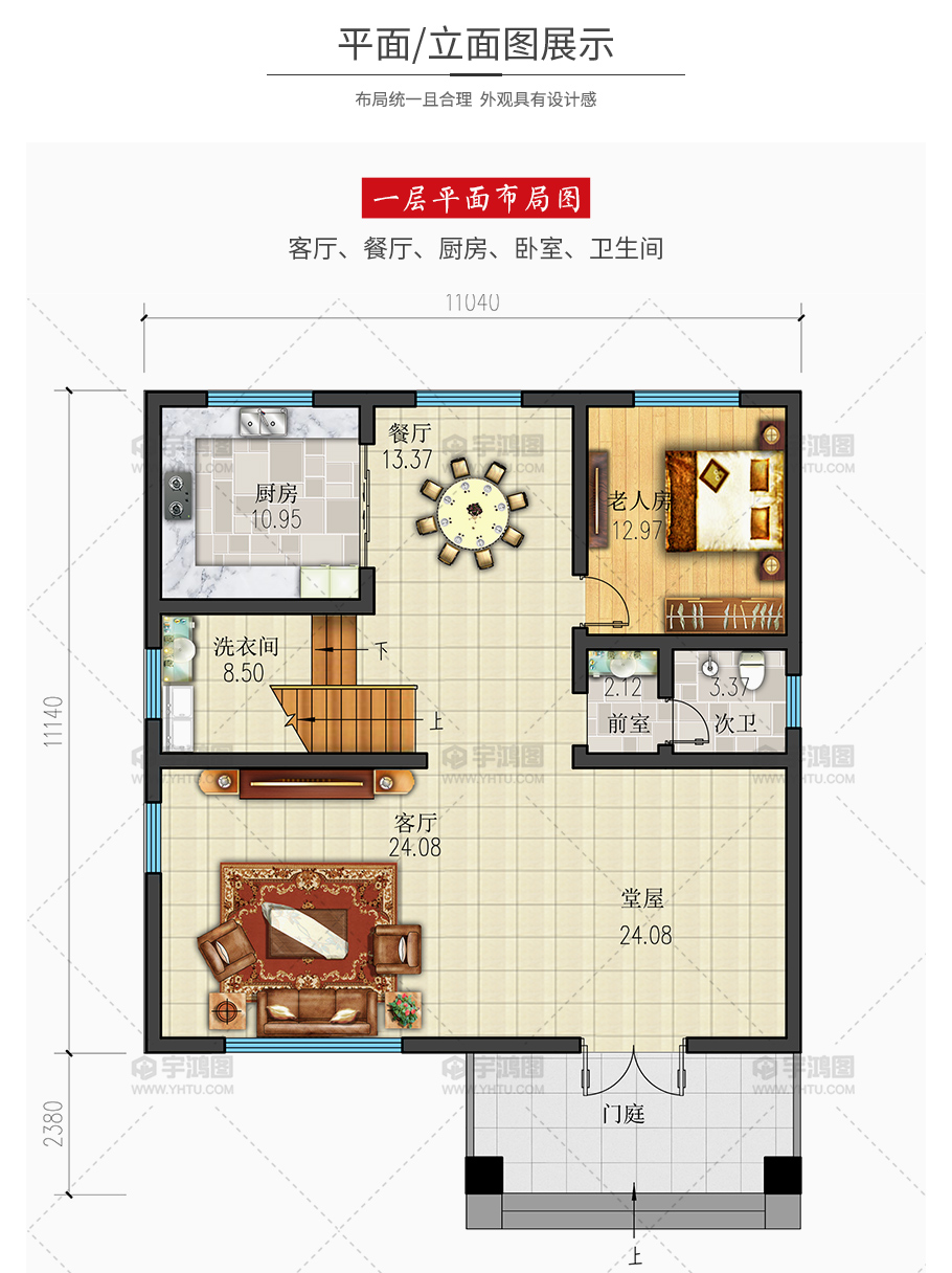 | 開間:11.04米 | 進深:13.52米 | 占地面積:122.9平方米 | 建筑面積:234.85平方米 |