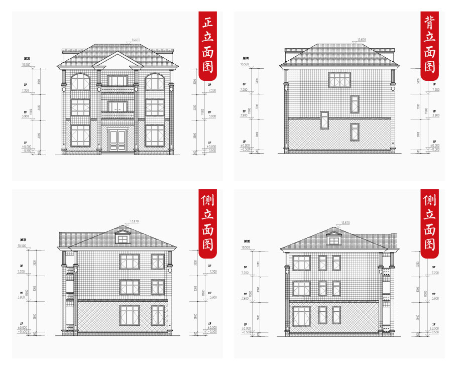 | 給排水圖: | 樓層給排水平面圖:一層給排水平面圖,二層給排水平面圖,三層給排水平面圖; 屋頂給排水平面圖; 衛生間排水系統圖 |