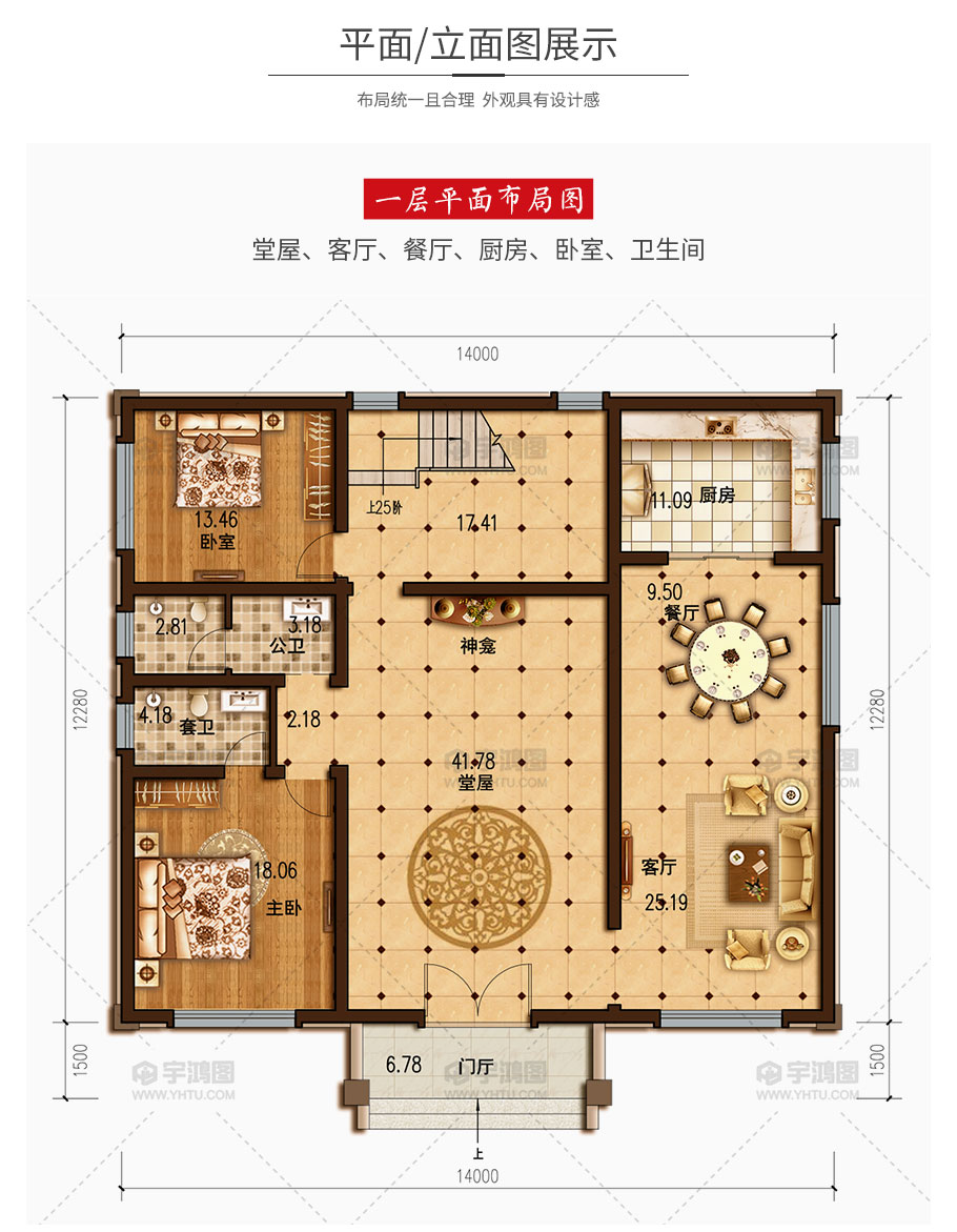 | 開間:14米 | 進深:13.78米 | 占地面積:171.9平方米 | 建筑面積:528平方米 |