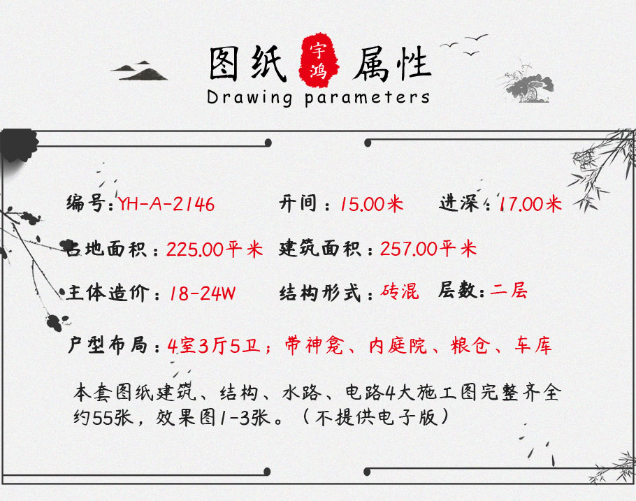 開間:15米 進深:17米 占地面積:225平方米 建筑面積:257平方米