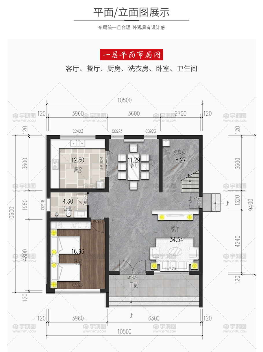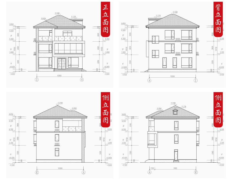 建筑立面圖:東立面圖,西立面圖,南立面圖,北立面圖,剖面圖;