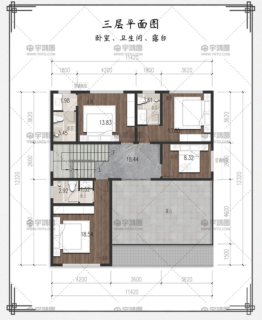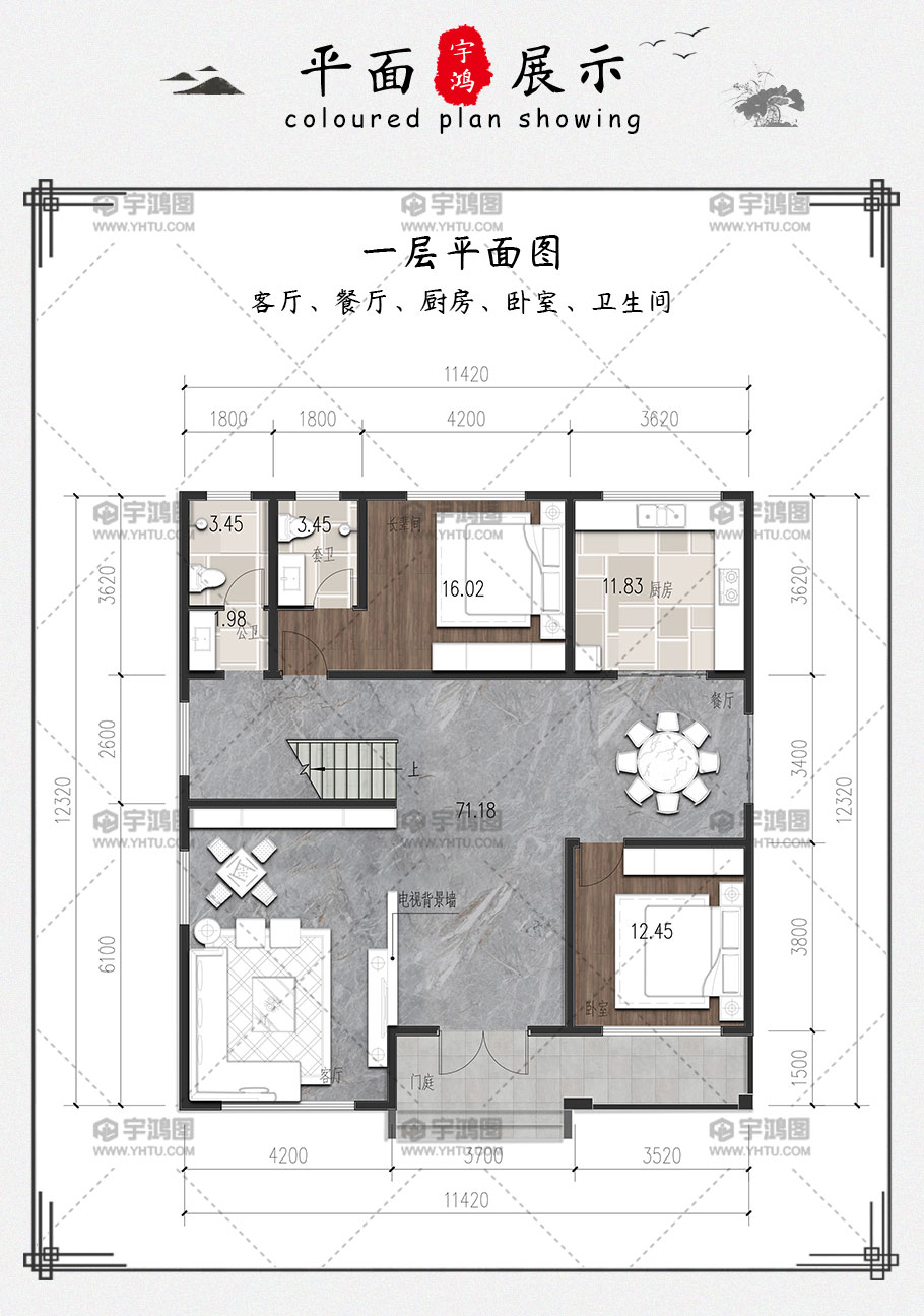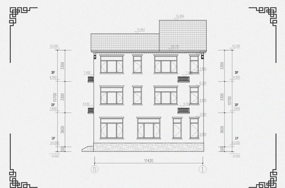 開間:11.42米 進深:12.32米 占地面積:145平方米 建筑面積:348.1平方米