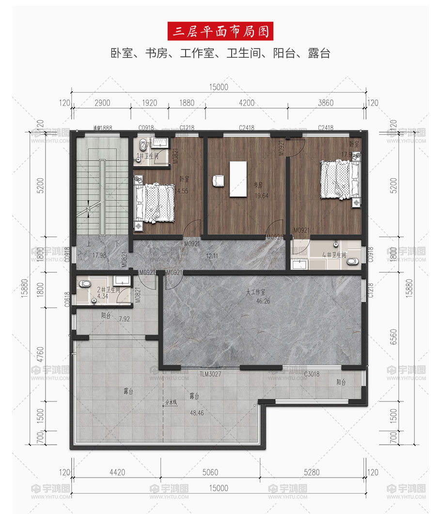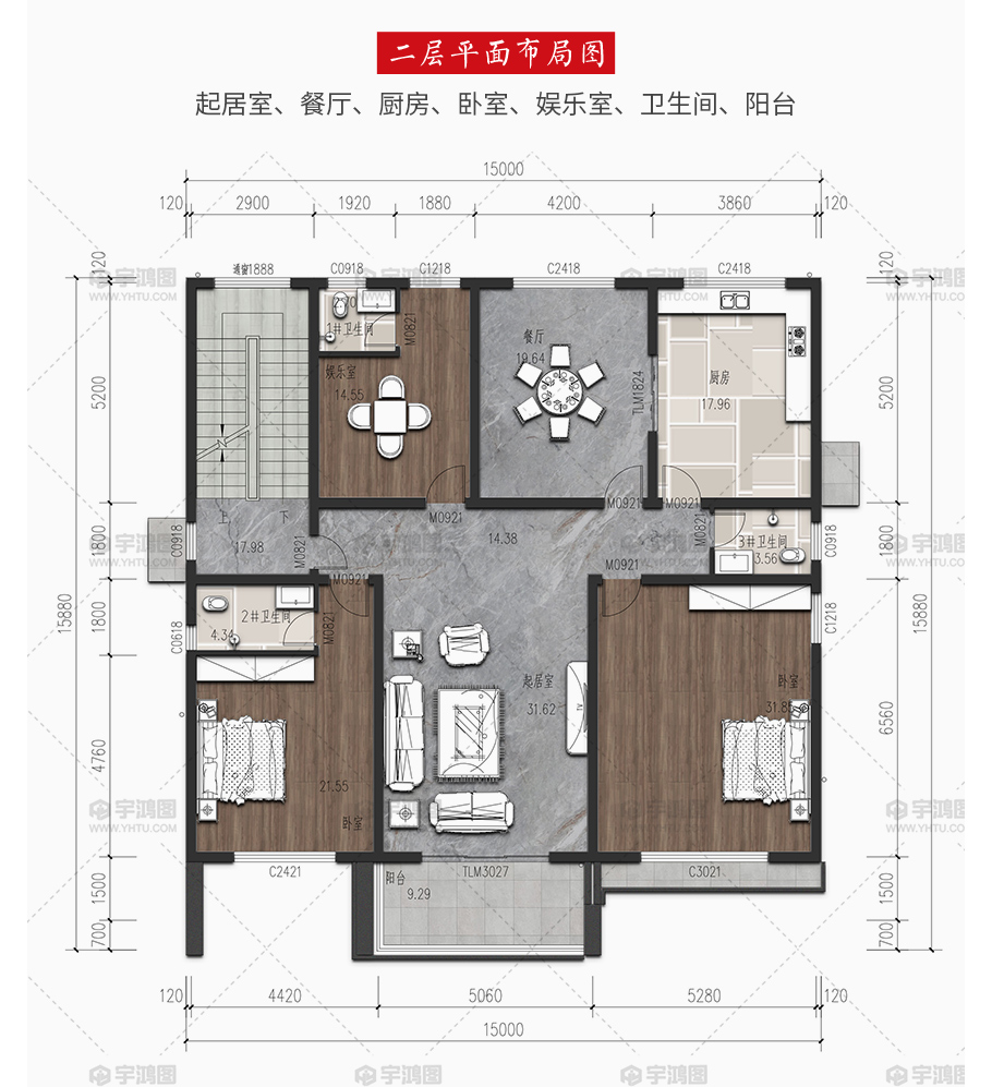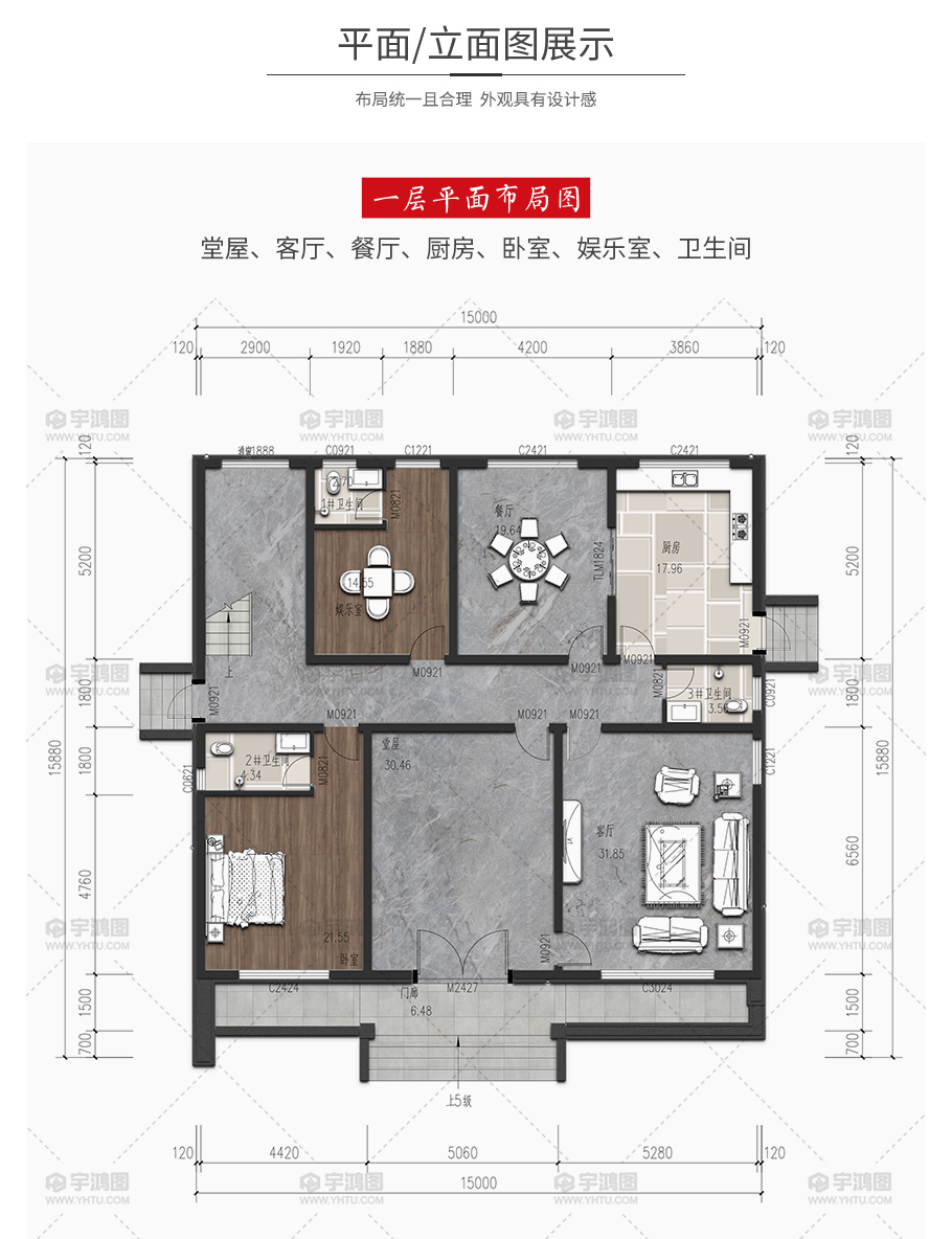 | 開間:15米 | 進深:15.88米 | 占地面積:229.5平方米 | 建筑面積:600.6平方米 |