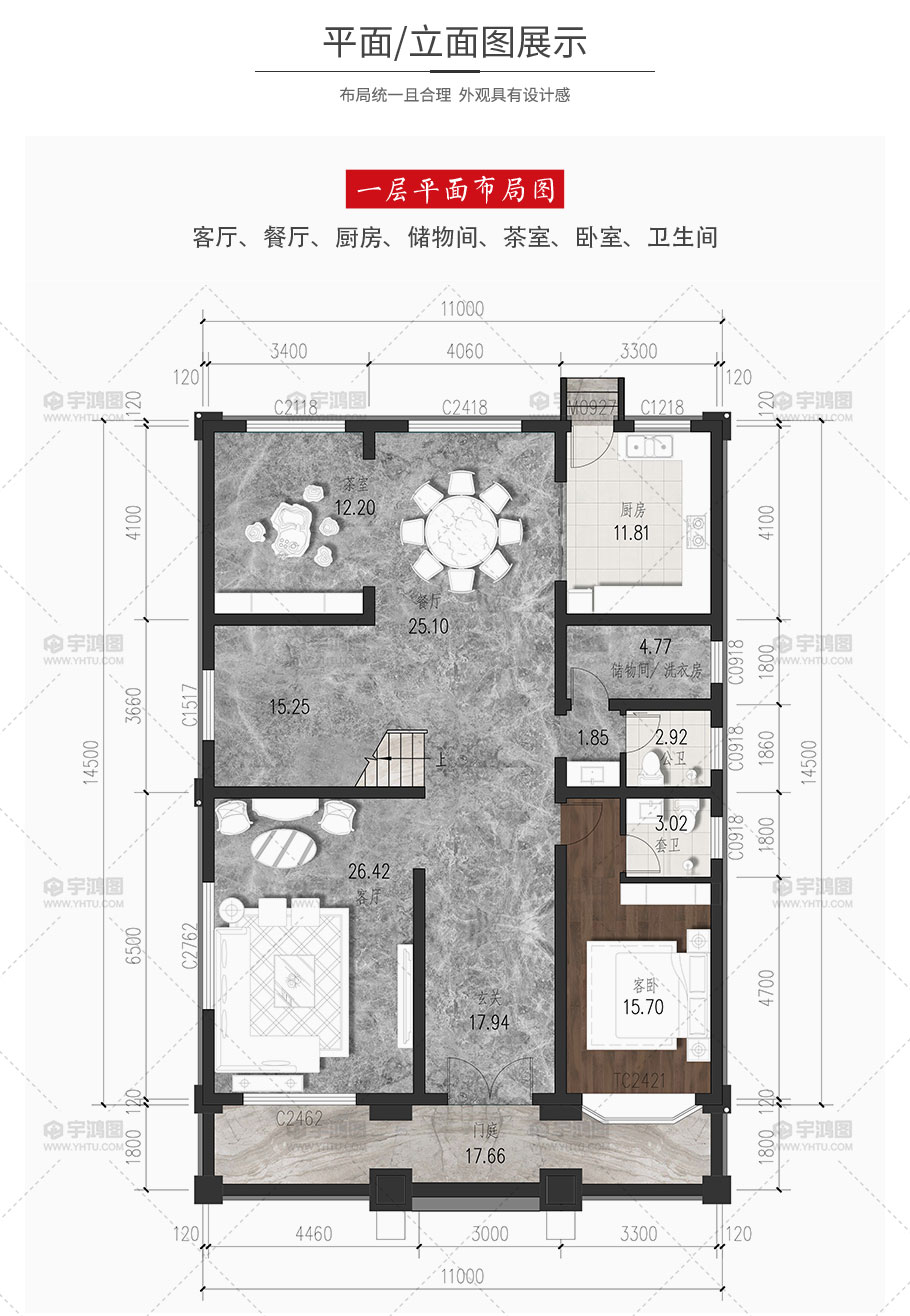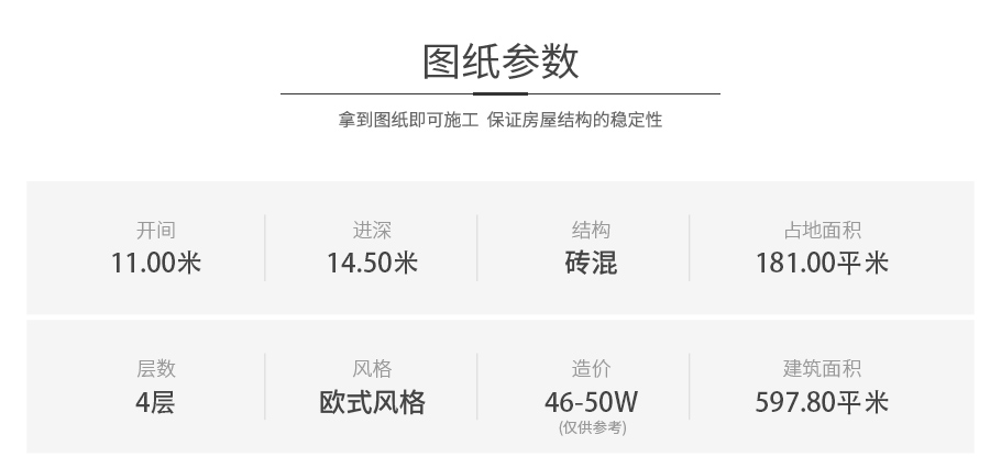 | 開間:11米 | 進深:14.5米 | 占地面積:181平方米 | 建筑面積:597.8平方米 |