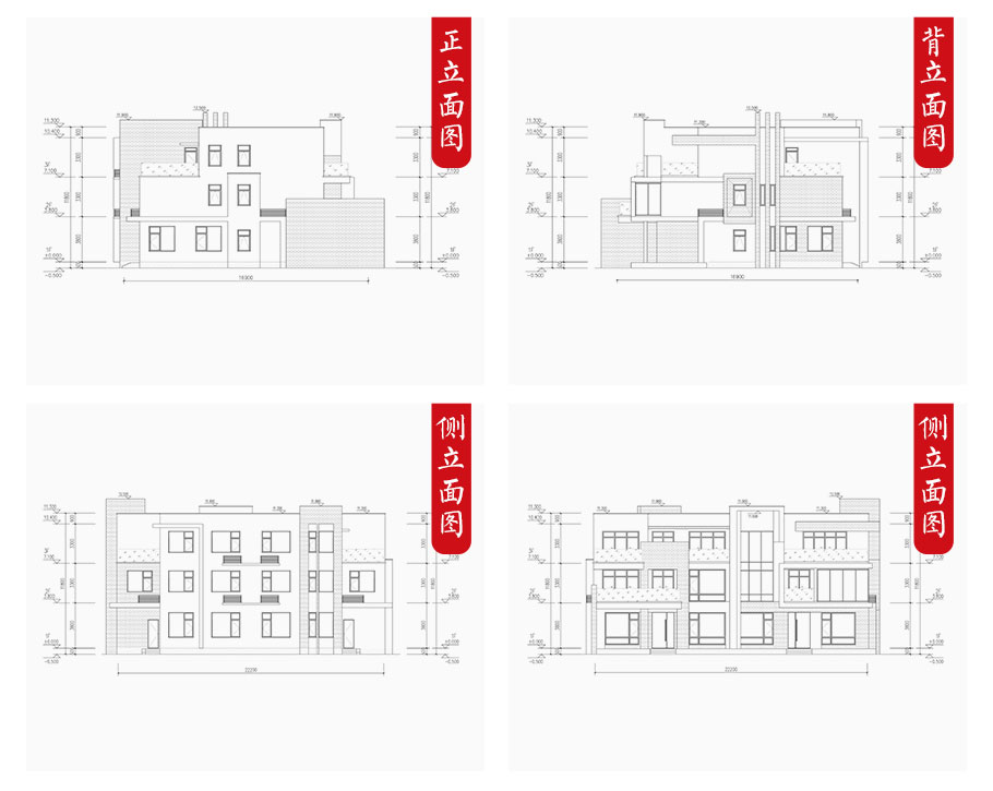建筑平面圖:一層平面圖,二層平面圖,三層平面圖; 建筑立面圖:東立面圖,西立面圖,南立面圖,北立面圖,剖面圖; 大樣圖:樓梯詳圖,細部大樣,門窗大樣 |