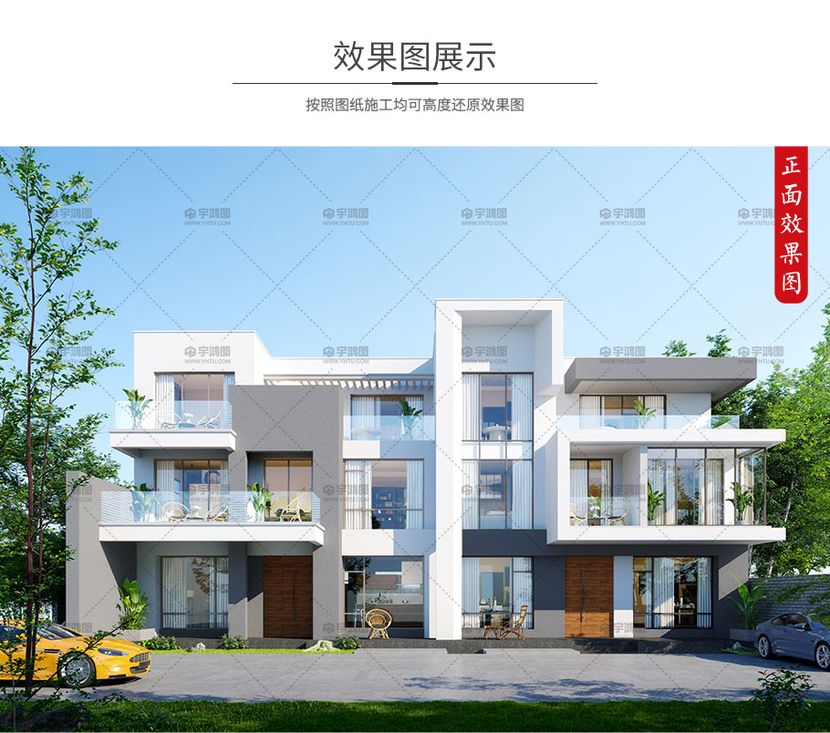 成品圖紙>高端大氣三層現(xiàn)代雙拼別墅占地305平框架別墅