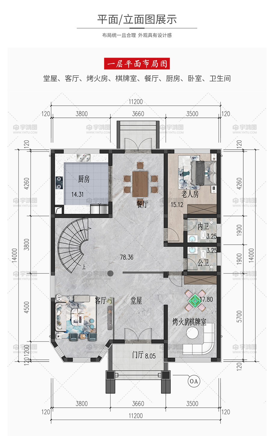 | 開間:11.2米 | 進深:14米 | 占地面積:158.46平方米 | 建筑面積:284.23平方米 |