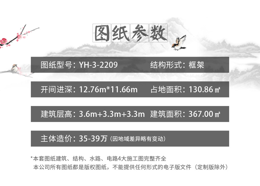 樓層給排水平面圖:一層給排水平面圖,二層給排水平面圖,三層給排水平面圖; 屋頂給排水平面圖; 衛生間排水系統圖 |
