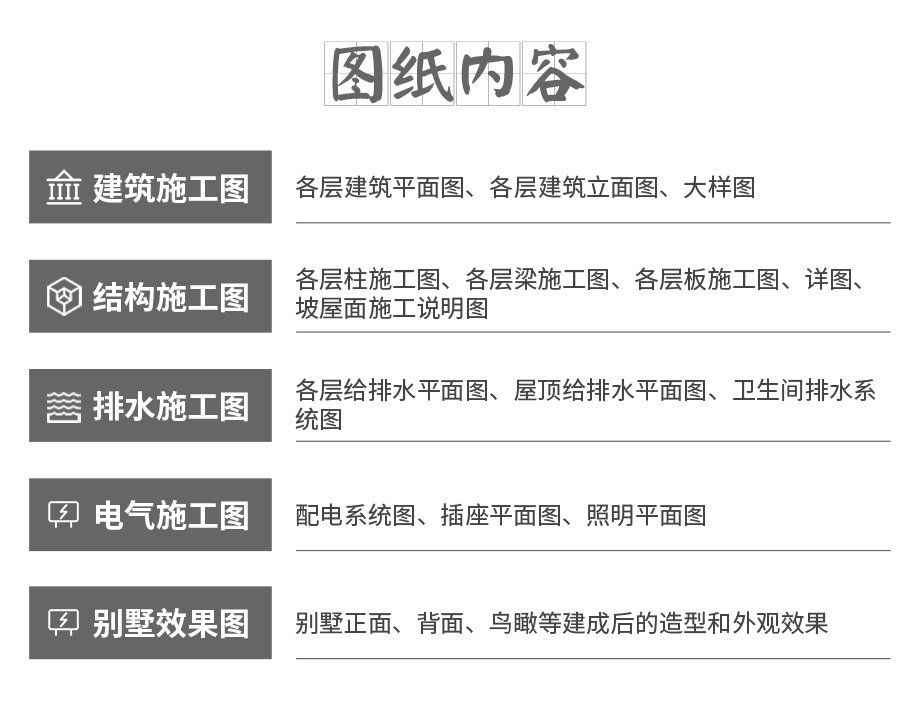 電氣圖: 配電系統圖; 插座平面圖:一層插座平面圖,二層插座平面圖,三層插座平面圖,屋頂層插座平面圖; 照明平面圖:一層照明平面圖,二層照明平面圖,三層照明平面圖,屋頂照明平面圖接地平面圖,防雷平面圖