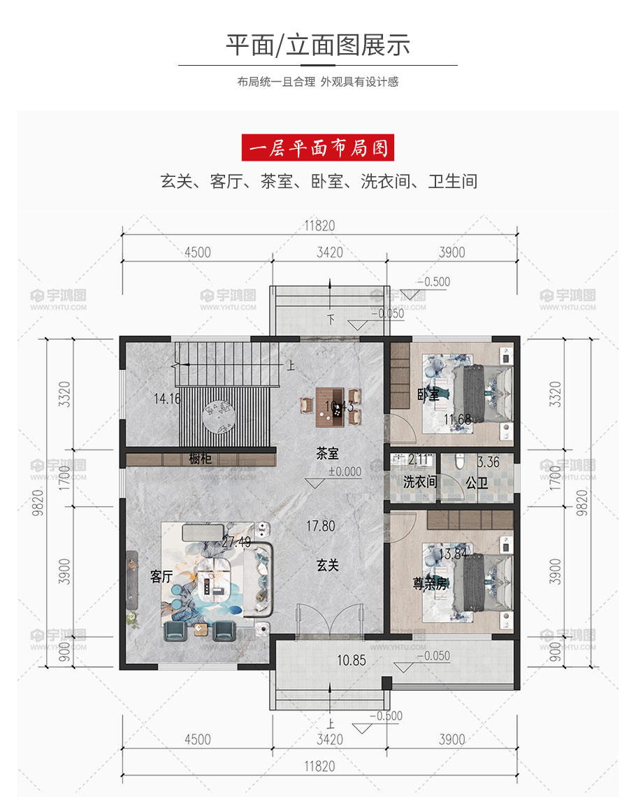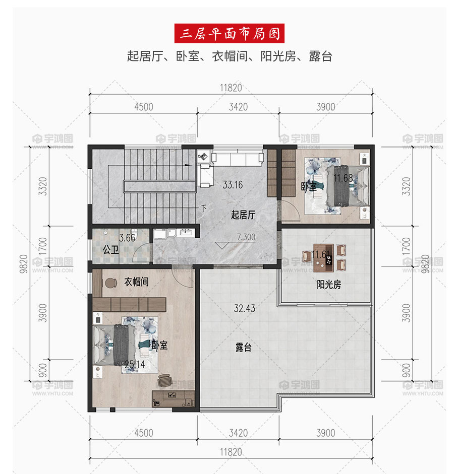 開間:11.82米 進深:9.82米 占地面積:124.5平方米 建筑面積:338.65平方米