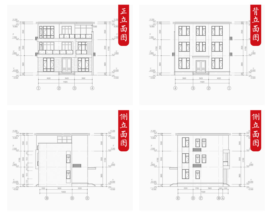 建筑圖: 建筑平面圖:一層平面圖,二層平面圖,三層平面圖; 建筑立面圖:東立面圖,西立面圖,南立面圖,北立面圖,剖面圖; 大樣圖:樓梯詳圖,細部大樣,門窗大樣