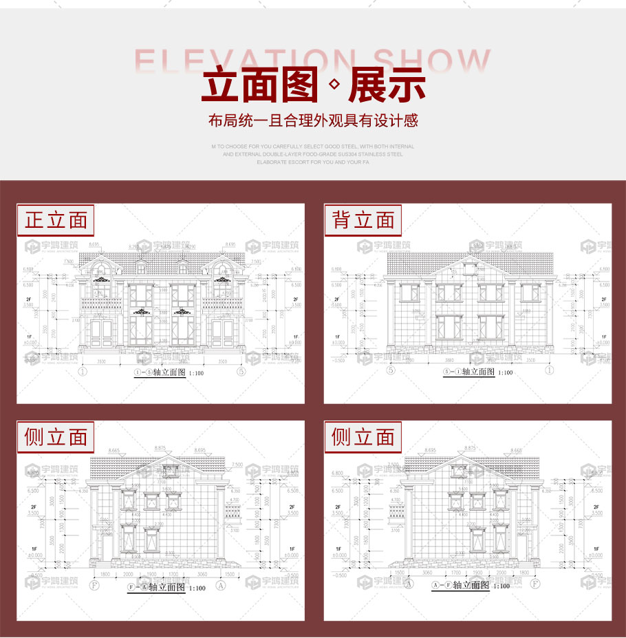 建筑平面圖:一層平面圖,二層平面圖; 建筑立面圖:東立面圖,西立面圖,南立面圖,北立面圖,剖面圖; 大樣圖:樓梯詳圖,細(xì)部大樣,門窗大樣 |