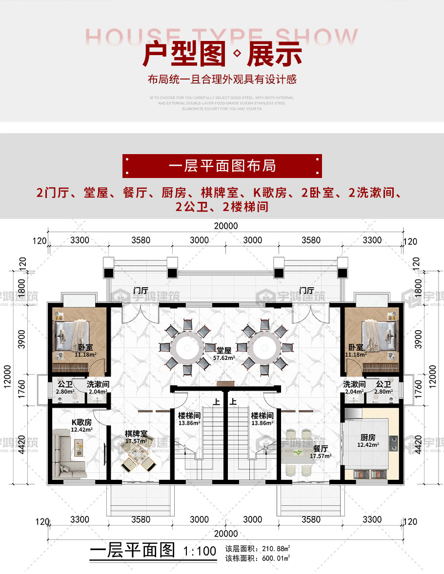 | 開間:20米 | 進深:12米 | 占地面積:210.88平方米 | 建筑面積:600.01平方米 |