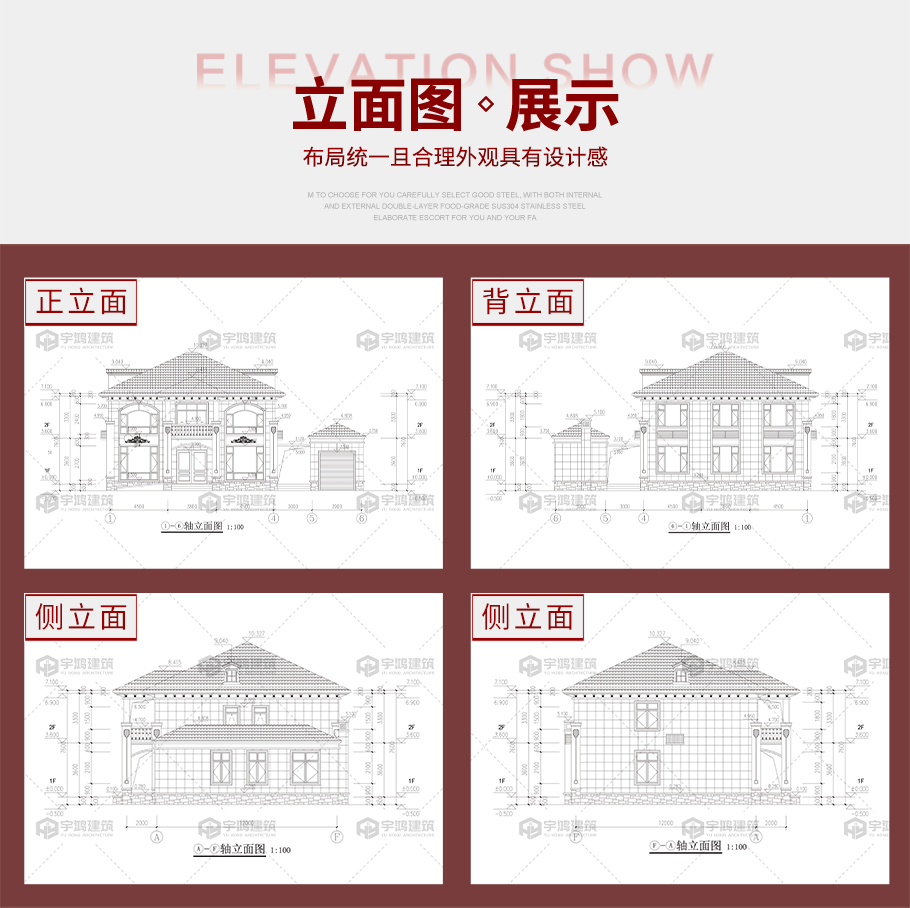 建筑平面圖:一層平面圖,二層平面圖; 建筑立面圖:東立面圖,西立面圖,南立面圖,北立面圖,剖面圖; 大樣圖:樓梯詳圖,細部大樣,門窗大樣 |