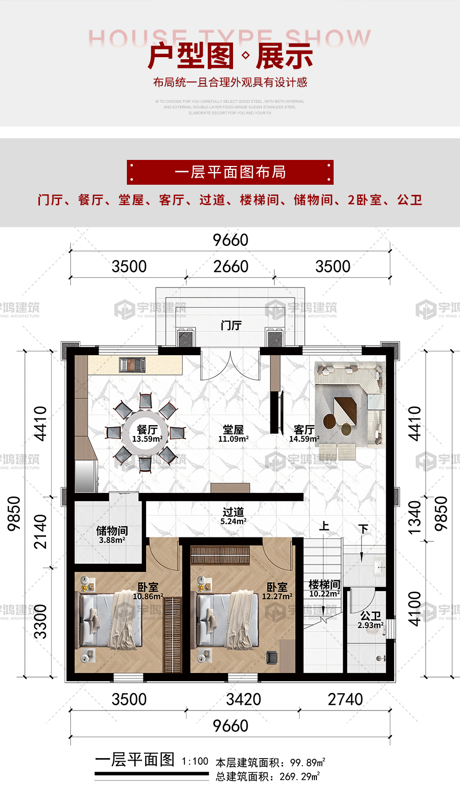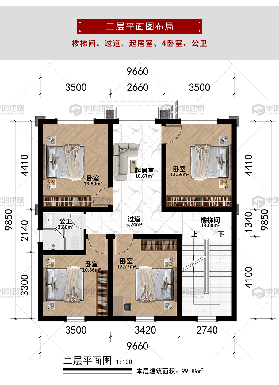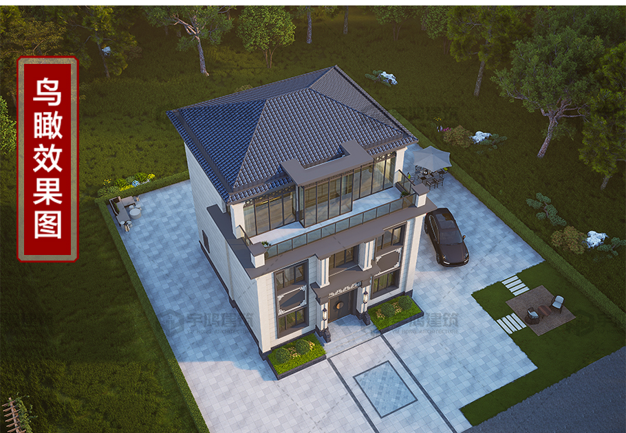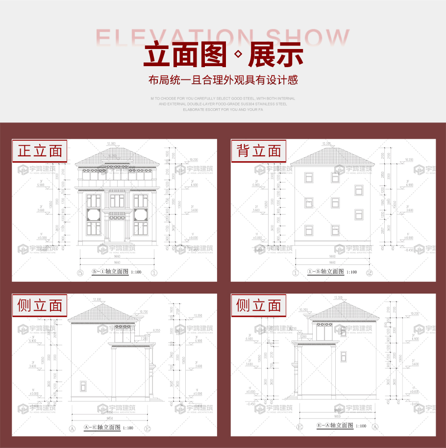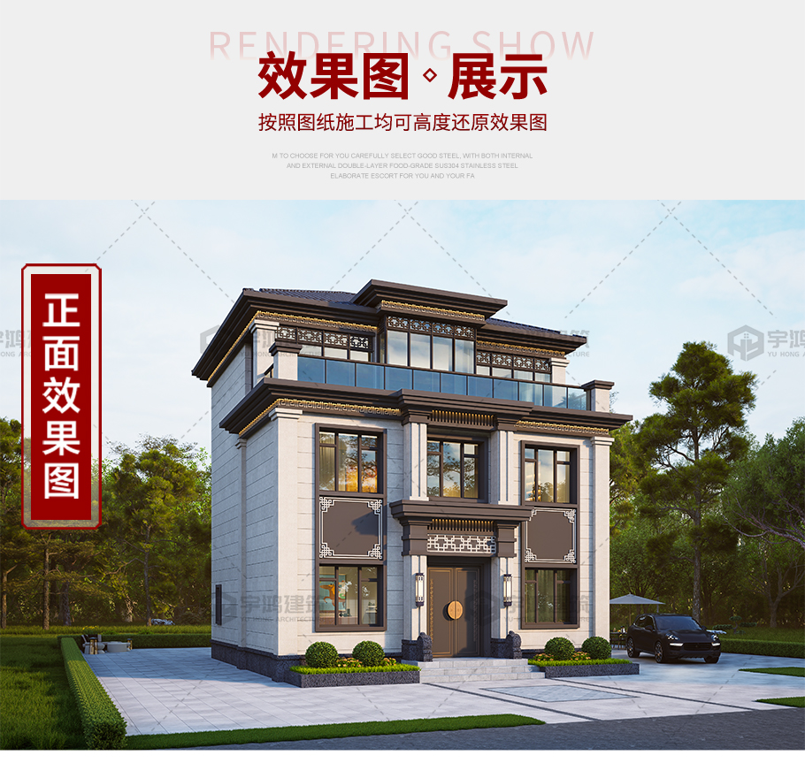 成品圖紙>開間進(jìn)深9.66*9.85新中式三層別墅全套圖紙