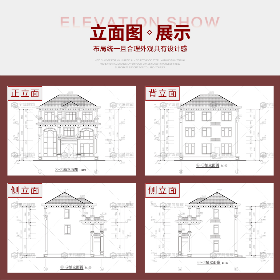 | 建筑圖: | 建筑平面圖:一層平面圖,二層平面圖,三層平面圖; 建筑立面圖:東立面圖,西立面圖,南立面圖,北立面圖,剖面圖; 大樣圖:樓梯詳圖,細(xì)部大樣,門(mén)窗大樣 |