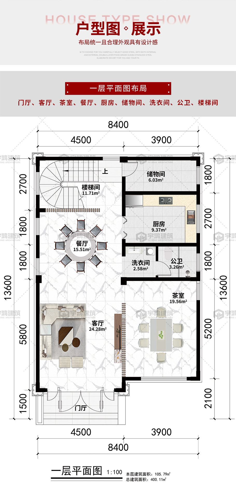 開間:8.4米 進深:13.6米 占地面積:108.39平方米 建筑面積:400.11平方米