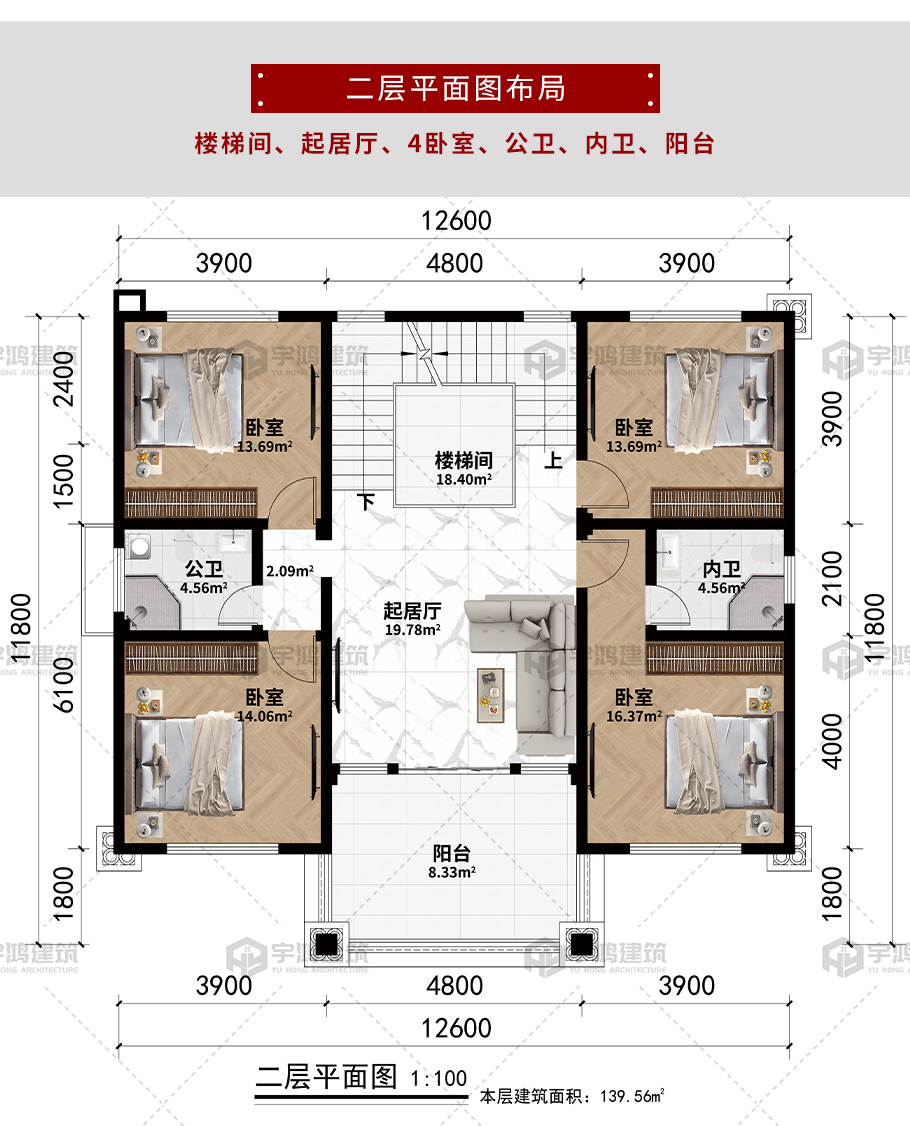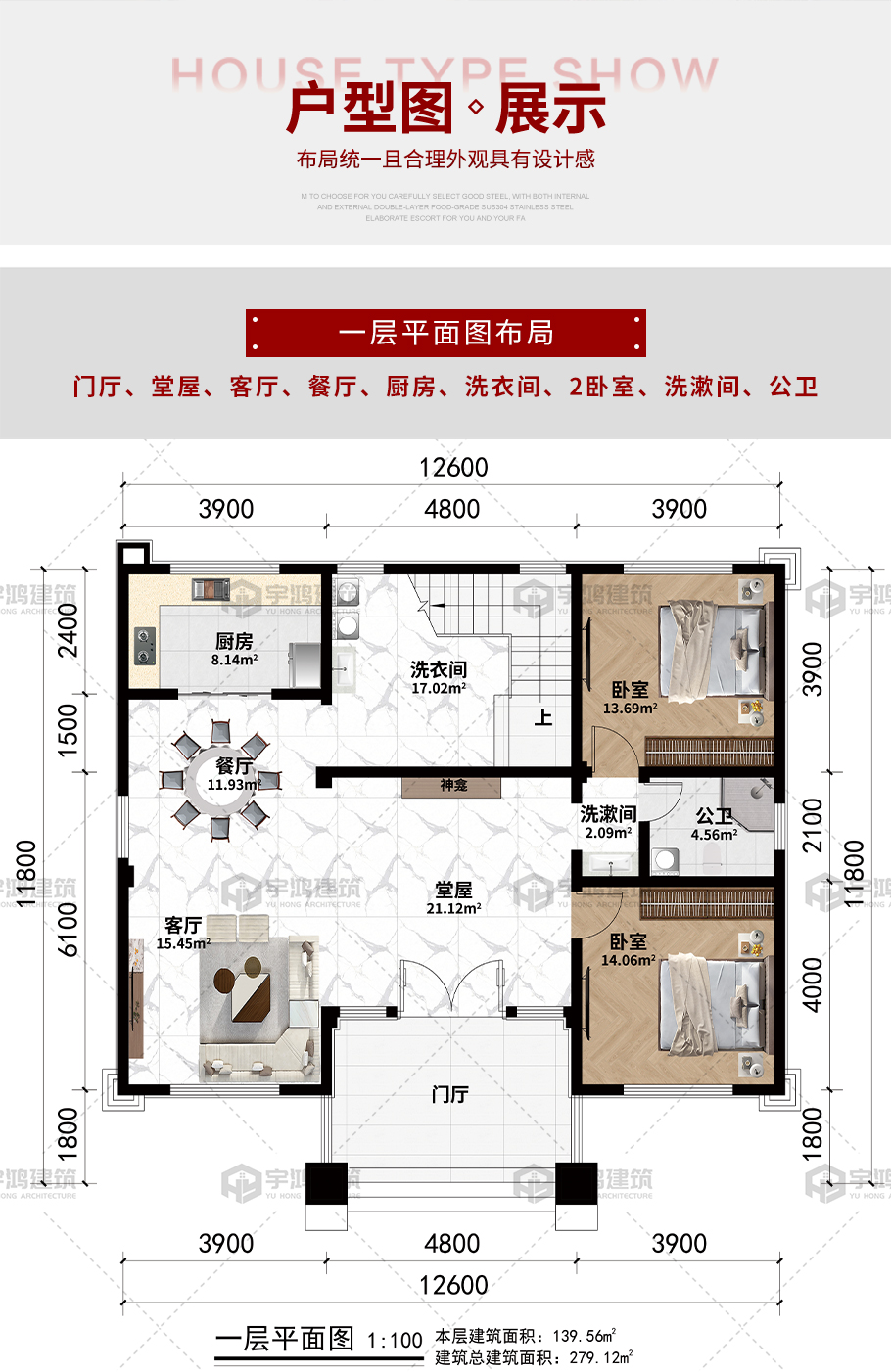 | 開(kāi)間:12.6米 | 進(jìn)深:11.8米 | 占地面積:139.56平方米 | 建筑面積:279.12平方米 |