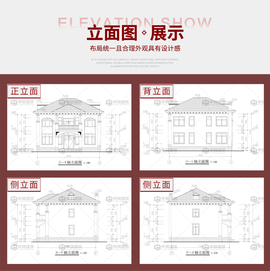 | 建筑圖: | 建筑平面圖:一層平面圖,二層平面圖; 建筑立面圖:東立面圖,西立面圖,南立面圖,北立面圖,剖面圖; 大樣圖:樓梯詳圖,細(xì)部大樣,門窗大樣 |