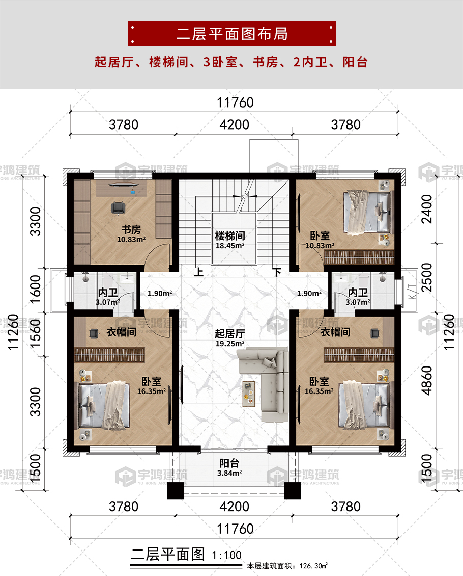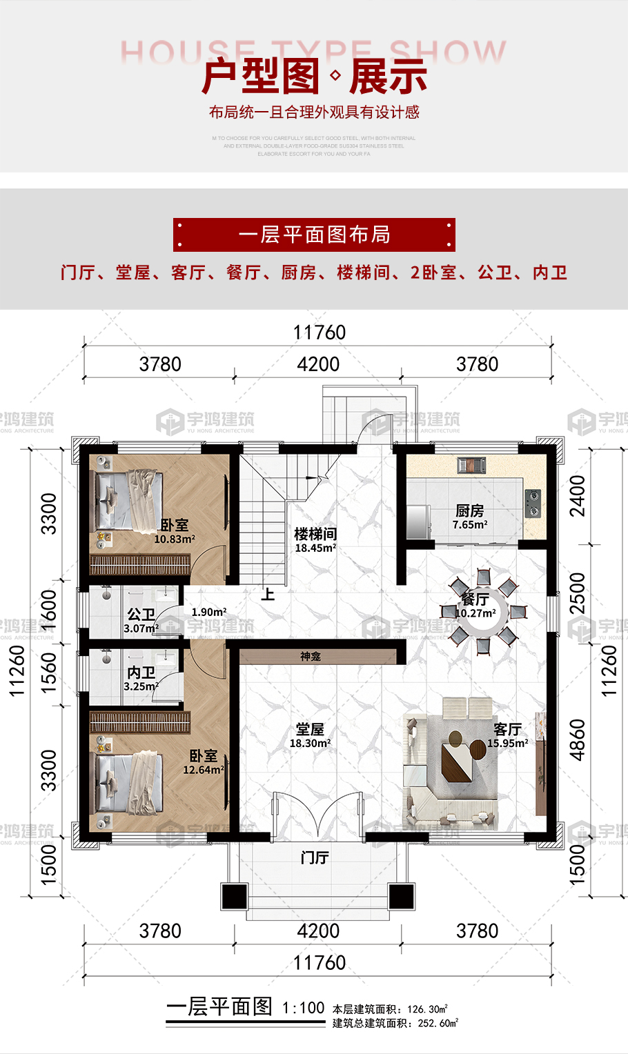 | 開(kāi)間:11.76米 | 進(jìn)深:11.26米 | 占地面積:126.3平方米 | 建筑面積:252.6平方米 |