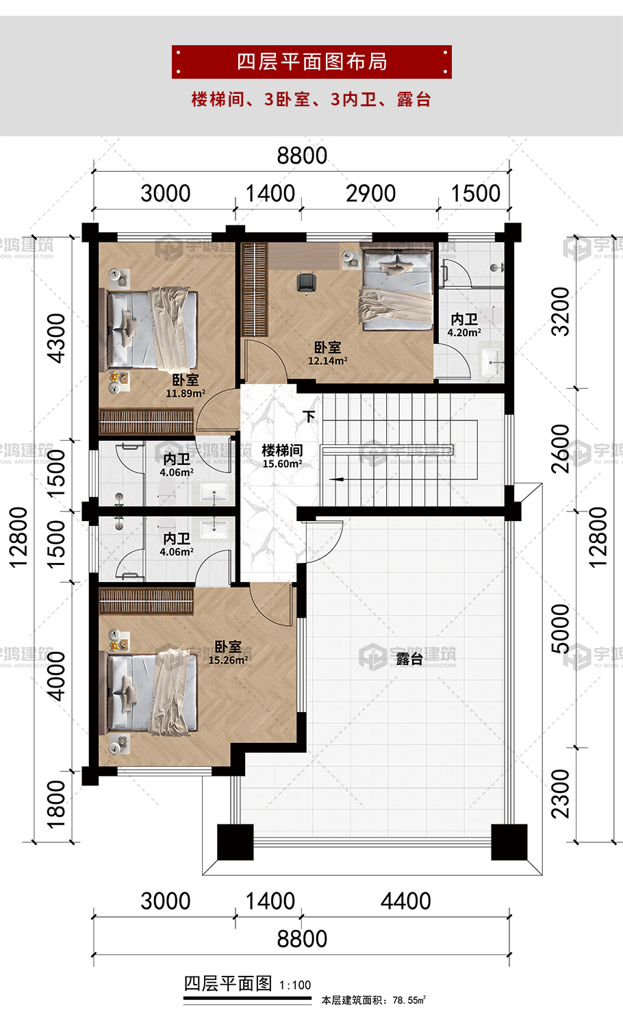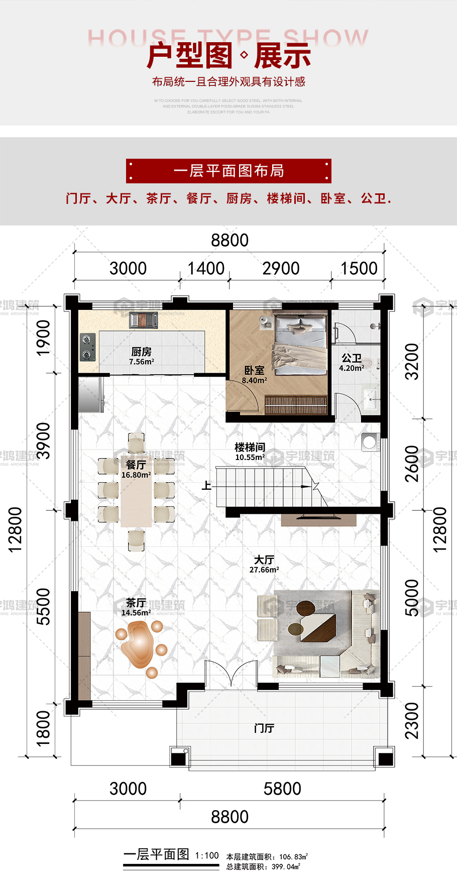 | 開間:8.8米 | 進深:12.8米 | 占地面積:113.55平方米 | 建筑面積:399.04平方米 |